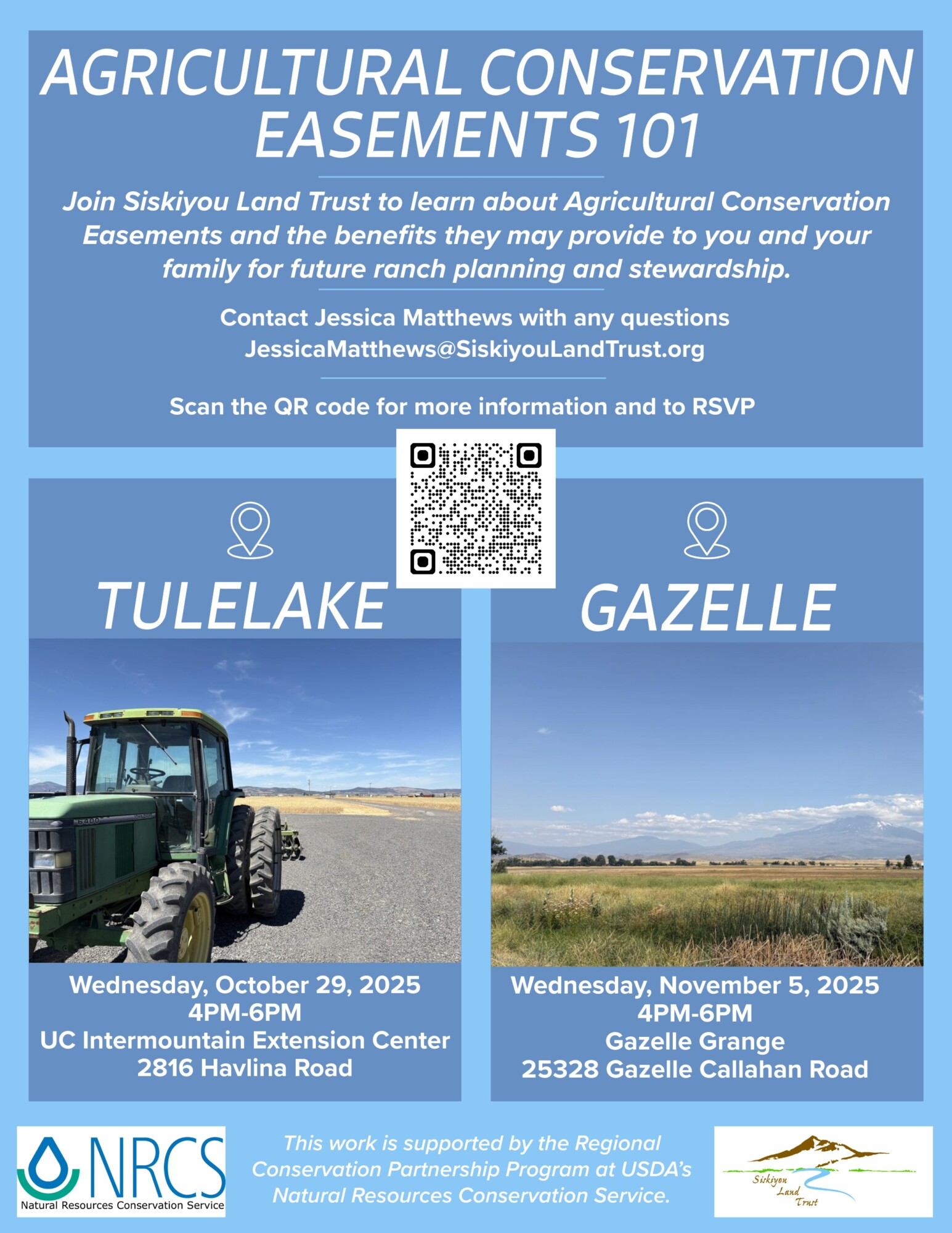Join Siskiyou Land Trust for an informational workshop on conservation easements (CE). Come learn about how conservation easements work and how CEs can benefit your family, your land, and help protect Siskiyou County’s vital landscapes. This workshop focuses on CEs over agricultural lands and provides information about the state and federal programs that support our work (NRCS and CA Department Of Conservation).