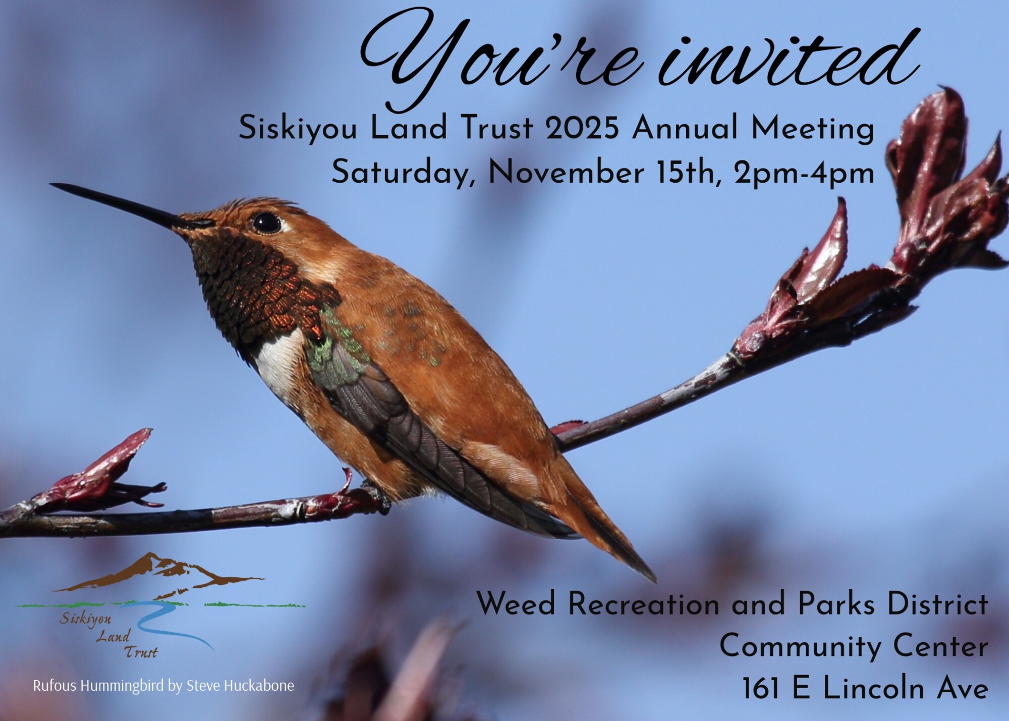 Save the date for Siskiyou Land Trust’s 2025 Annual Meeting! We can’t wait to welcome you to the Weed Community Center 161 E Lincoln Ave, Weed, CA 96094. Join us on November 15th from 2pm-4pm for land trust updates, awards, refreshments, and a community conservation celebration.