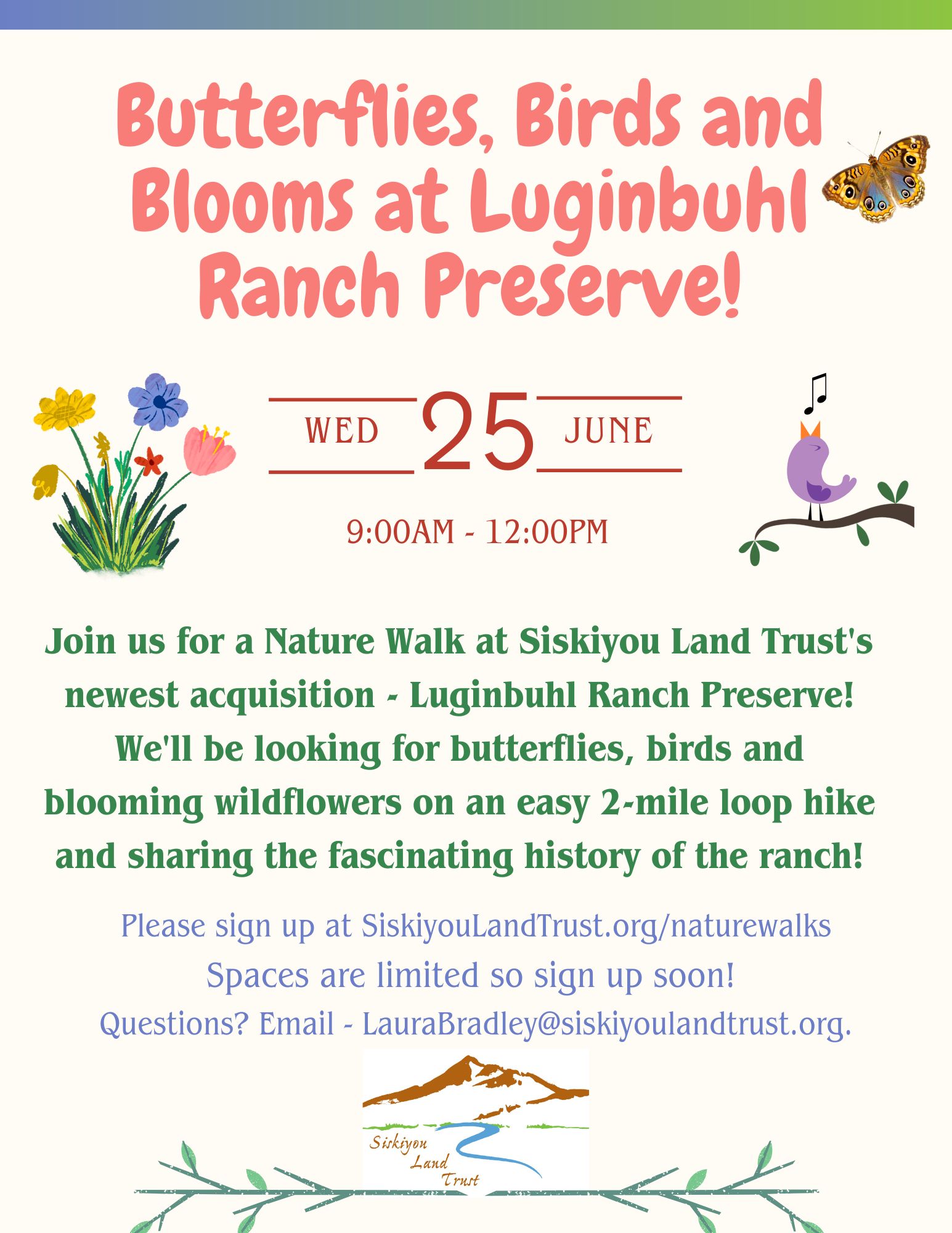Join us for a Nature Walk at Siskiyou Land Trust’s newest acquisition – Luginbuhl Ranch Preserve! We’ll be looking for butterflies, birds and blooming wildflowers on an easy 2-mile loop hike and sharing the fascinating history of the ranch!