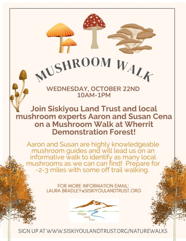 Join Siskiyou Land Trust and local mushroom experts Aaron and Susan Cena on a Mushroom Walk at Wherrit Demonstration Forest!