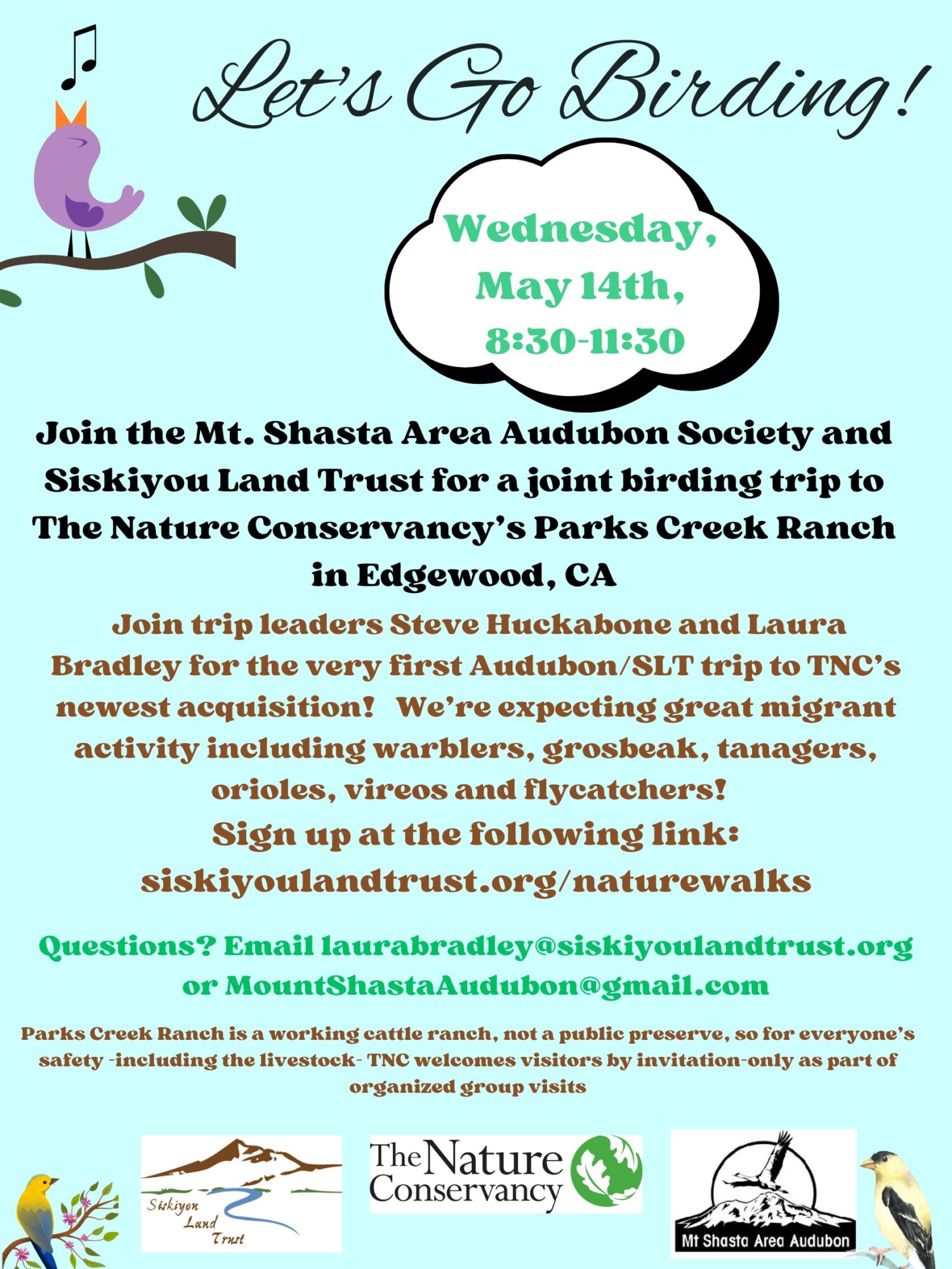 Join the Mt. Shasta Area Audubon Society and Siskiyou Land Trust for a joint birding trip to The Nature Conservancy’s Parks Creek Ranch in Edgewoood, CA.