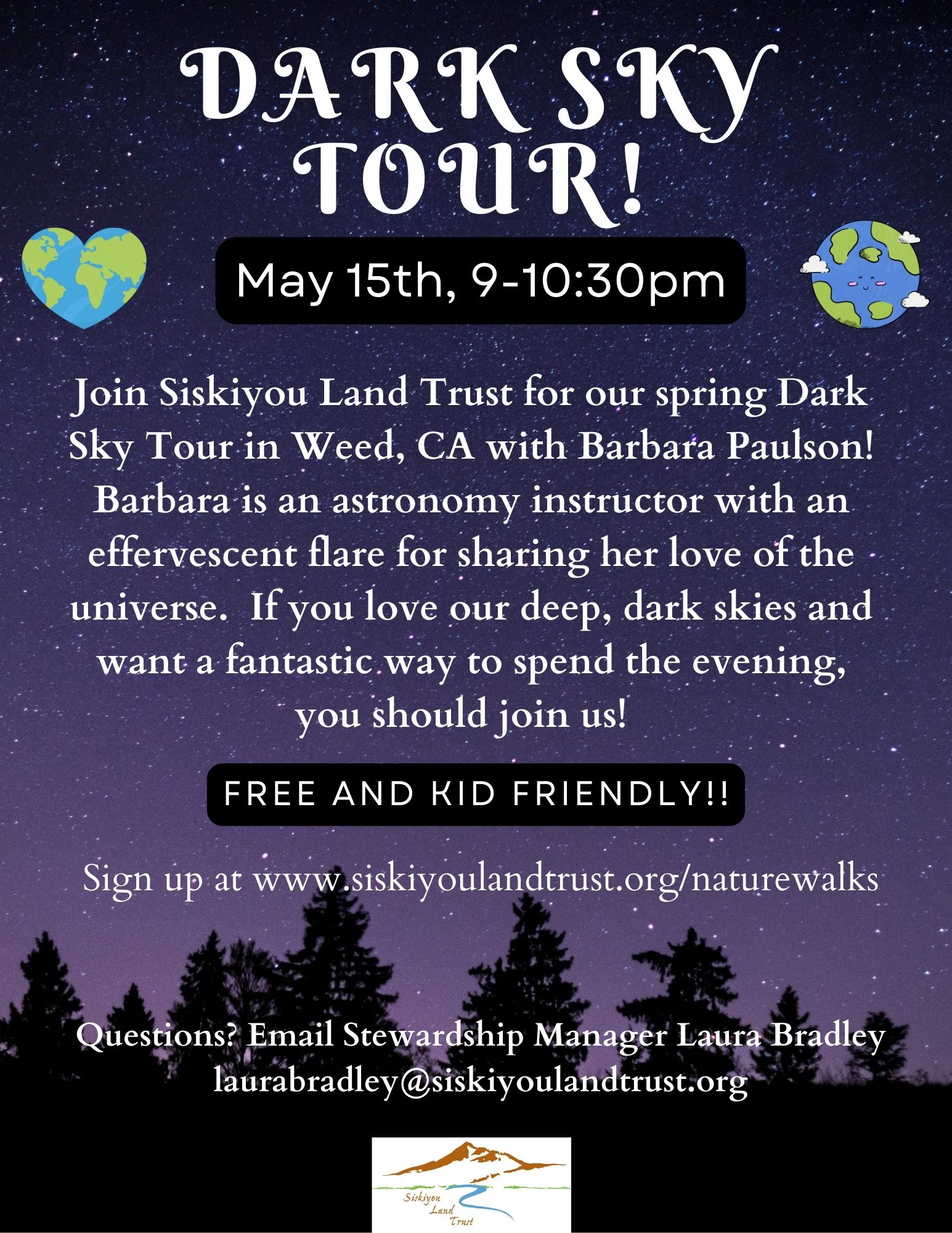 Join Siskiyou Land Trust for our spring Dark Sky Tour in Weed, CA with Barbara Paulson! Barbara is an astronomy instructor with an effervescent flare for sharing her love of the universe. If you love our deep, dark skies and want a fantastic way to spend the evening, you should join us! Directions and details will be provided once you sign up.Â