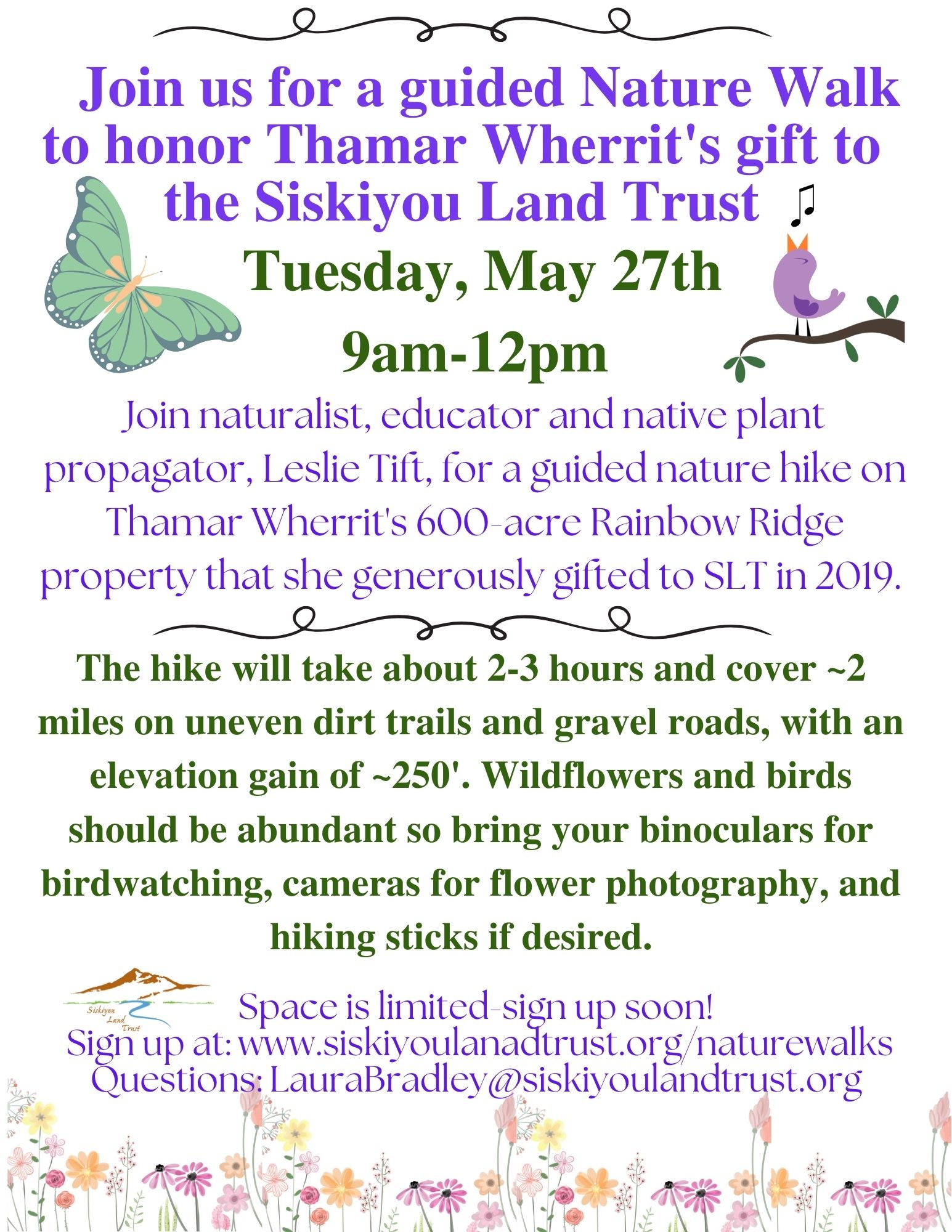 Join naturalist, educator and native plant propagator, Leslie Tift, for a guided nature hike on Thamar Wherrit’s 600-acre Rainbow Ridge property that Thamar generously gifted to SLT in 2019.